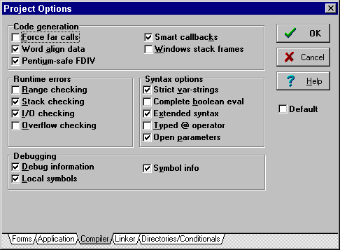 · Страница Compiler включает установки для генерации кода, управления обработкой ошибок времени выполнения, синтаксиса, отладки и др.
