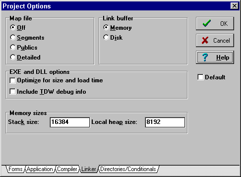 Размер стека (Stack Size) и локальной динамической памяти (Heap Size) весьма важны. Delphi устанавливает по умолчанию и Stack Size, и Heap Size в 8192 байт каждый. Вам может понадобиться изменить размер стека в программе, но обычно это не более 32Кб. В сумме эти два размера не должны превышать 64Кб, иначе будет выдаваться ошибка при компиляции программы.