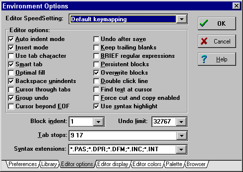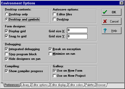 Пункт меню “Options | Environment” предоставляет Вам большой набор страниц и управляющих элементов, которые определяют внешний вид и работу IDE. Delphi позволяет сделать следующие важные настройки: