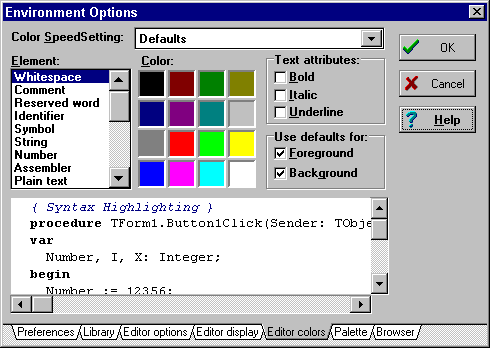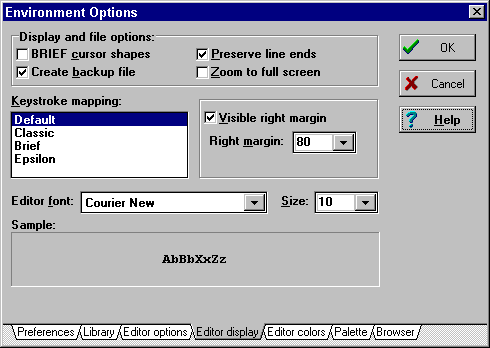 Страницы Editor Options, Editor Display и Editor Colors позволяют Вам изменить цвета и “горячие” клавиши, используемые IDE. Страница Editor Display показана на рис.10, а Editor Colors - на рис.11.