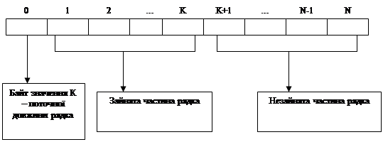 Для рядкових змінних пам’ять виділяється відповідно максимального значення, а використовується лише частина, яка реально зайнята символами рядка у даний час, тобто для N символів виділяється N+1 байт пам’яті, із яких N байт призначено для зберігання символів рядка, а 1 байт – для значення поточної довжини цього рядка: