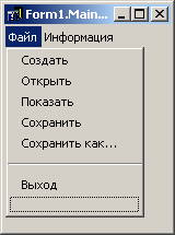 Для запуска процедур открытия или создания файла, разместим на форме объект MainMenu типа TMainMenu. Настройка пунктов меню приведена на рисунке 2.1