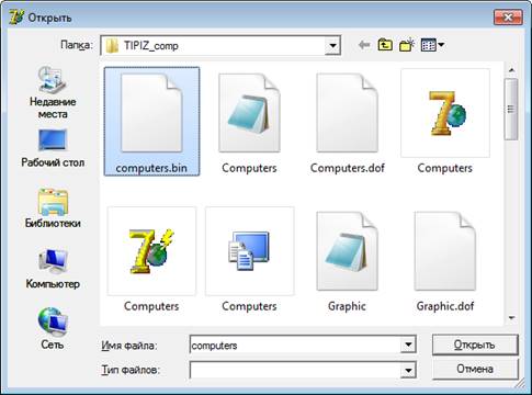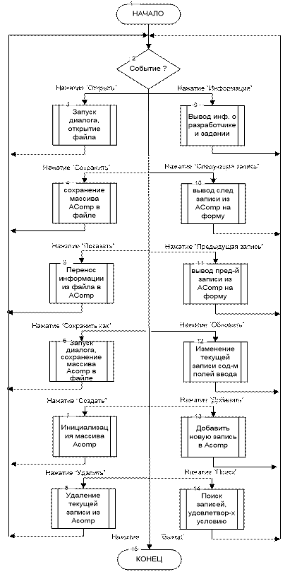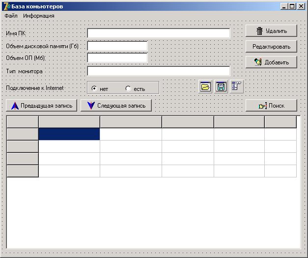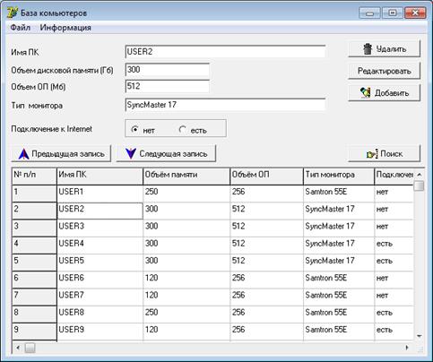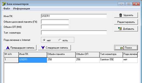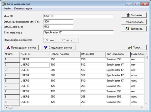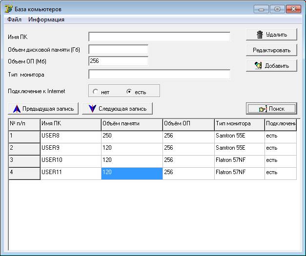- вывод информации об отдельном компьютере из типизированного файла на экранную форму в отдельные поля ввода;