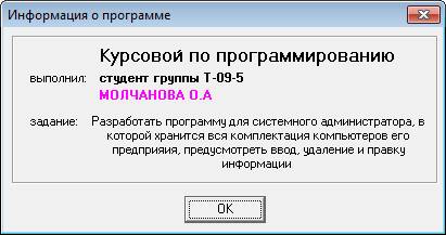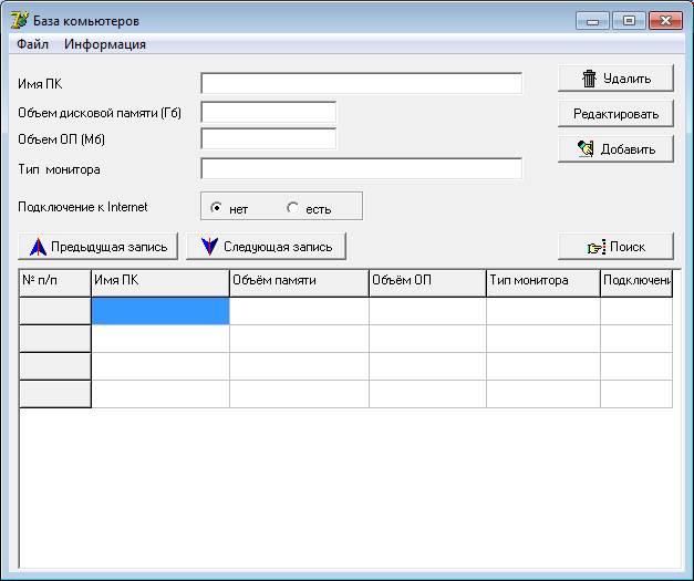1 Анализ технического задания и постановка задачи проектированияСогласно заданию необходимо разработать программу для системного администратора, в которой хранится вся комплектация компьютеров его предприятия, предусмотреть ввод, удаление и правку информации. При этом для каждого компьютера необходимо хранить следующую информацию: наименование, ёмкость жёсткого диска, ёмкость оперативной памяти, тип монитора, наличие подключения к интернет. Обработка должна включать: создание и чтение файла; дополнение, удаление, корректировка, поиск данных файла.