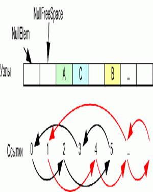 Таким образом, чтобы определить, есть ли в списке свободное место, надо посмотреть значение элемента Refs(NullFreeSpace). Если это значение равно NullFreeSpace (т.е. показывает на себя), то свободного места нет. В противном случае это значение указывает на первый свободный элемент массива элементов. При добавлении элемента к списку необходимо исключить индекс этого элемента из списка свободных и включить его в основной список. При удалении элемента необходимо произвести обратную операцию.