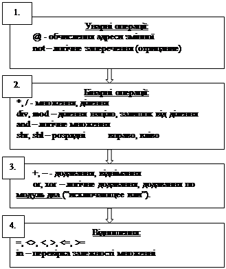 логічні: Ù (and ), Ú (or ), Ø (not ) <, <=, =, <>, >=
