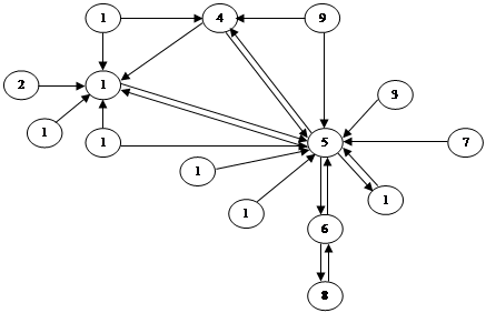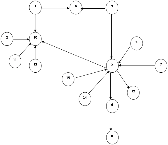 Ранги элементов структуры позволяют расположить элементы по иерархическим уровням СУ. Определение рангов вершин ГСУ выполняется с помощью алгоритма ранжирования или определения порядковой (ранговой) функции на графе. Алгоритм ранжирования имеет смысл на графе без контуров, поэтому исходный граф необходимо преобразовать, размыкая имеющиеся контуры, путем удаления некоторых дуг (рисунок 5.3). В результате проделанных действий были получены ранги, представленные на рисунке 5.4.