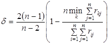 Для того чтобы результат вычислений по формуле был определен, элементам матрицы расстояний R, равным бесконечности, присваивается конечная величина n, т.е. вместо