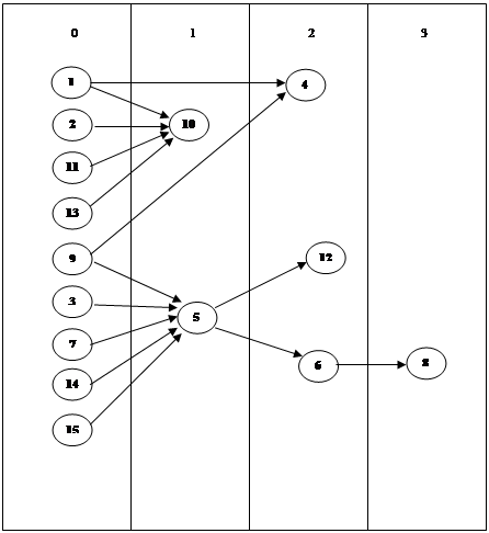В результате выполнения алгоритма, получим следующее ранжирование вершин: ранг 0 имеют вершины 1,2,11,13,9,3,7,14 и 15, ранг 1 — вершины 5 и 10, ранг 2 — вершины 4,12 и 6, ранг 3 — вершина 8.