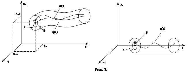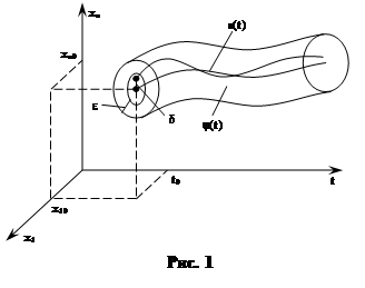 Геометрически это означает, что все решения, которые при t=t0 начинаются в d-окрестности точки (x10, x20, …, xn0), никогда не покинут e-трубку решения si(t) (рис. 1).