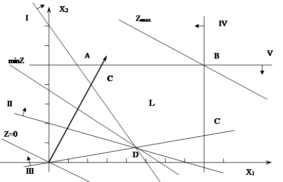 Область L определяется как общая часть полуплоскостей, соответствующих неравенствам ограничений (рисунок 1).