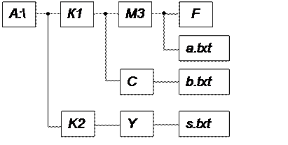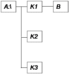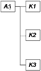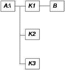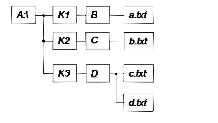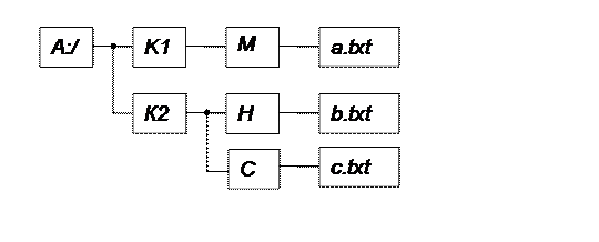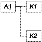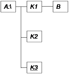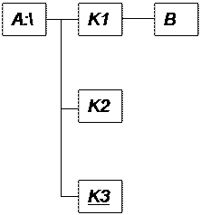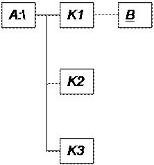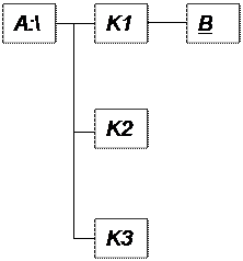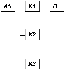 В корневом каталоге зарегистрированы 2 каталога, одна ветка доходит до 2 уровня. В родительском каталоге К1 создан файл с именем студента. В родительском каталоге К2 содержится файл подкаталог Н, в котором содержится файл с фамилией преподавателя информатики. Каталог К2 имеется ветка 2-го уровня, в котором находится файл с номер группы.