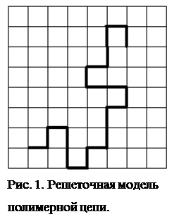 Целью другого подхода к постановке компьютерного эксперимента может быть понимание общих (универсальных или модельно-инвариантных) закономерностей поведения изучаемой системы, то есть таких закономерностей, которые определяются лишь наиболее типическими особенностями данного класса объектов, но не деталями химического строения отдельно взятого соединения. То есть в этом случае компьютерный эксперимент имеет своей целью установление функциональных связей, а не расчет числовых параметров. Эта идеология в наиболее отчетливой форме присутствует в скейлинговой теории полимеров. С точки зрения такого подхода компьютерное моделирование выступает в роли теоретического инструмента, который, прежде всего, позволяет проверить выводы существующих аналитических методов теории или дополнить их предсказания. Подобное взаимодействие между аналитической теорией и компьютерным экспериментом бывает очень плодотворным, когда в обоих подходах удается использовать идентичные модели. Наиболее ярким примером такого рода обобщенных моделей полимерных молекул может служить так называемая решеточная модель . На ее основе выполнено множество теоретических построений, в частности связанных с решением классической и, в каком то смысле, основной задачи физикохимии полимеров о влиянии объемных взаимодействий на конформацию и, соответственно, на свойства гибкой полимерной цепи. Под объемными взаимодействиями обычно подразумевают короткодействующие силы отталкивания, которые возникают между удаленными вдоль по цепи звеньями, когда они сближаются в пространстве за счет случайных изгибов макромолекулы. В решеточной модели реальную цепь рассматривают как ломаную траекторию, которая проходит через узлы правильной решетки заданного типа: кубической, тетраэдрической и др. Занятые узлы решетки соответствуют полимерным звеньям (мономерам), а соединяющие их отрезки - химическим связям в скелете макромолекулы. Запрет самопересечений траектории (или, иными словами, невозможность одновременного попадания двух и более мономеров в один решеточный узел) моделирует объемные взаимодействия (Рис. 1). То есть если, например, если используется метод МК и при смещении случайно выбранного звена оно попадает в уже занятый узел, то такая новая конформация отбрасывается и уже не учитывается в вычислении интересующих параметров системы. Различные расположения цепи на решетке соответствуют конформациям полимерной цепи. По ним и проводится усреднение требуемых характеристик, например расстояния между концами цепи R.