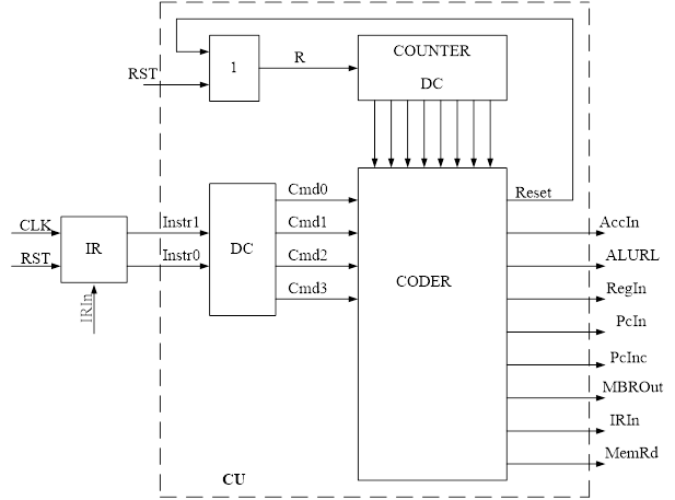 В наличии блок интерпретации кода операции, построенный на счетчике шагов, а также на декодере инструкции и шифраторе, выдающий управляющие сигналы (AccIn, ALURL, RegIn, PCIn, PCInc, MBROut, IRIn, MemRd, Reset).