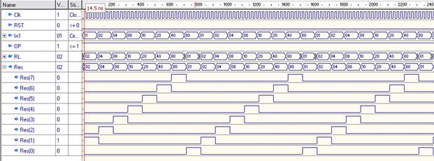 По диаграмме работы процессора видно, что выполнение команды пересылки занимает в среднем 100 ns, команда сдвига немного больше 125 ns. Полное выполнение всех команд производится за 1050 ns.