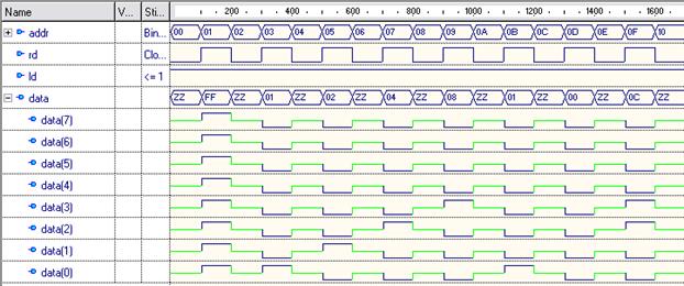 Программа для проверки работоспособности процессора написана в отдельном файле Mem.dat, хранящемся на диске, и подгружается в память прямо в процессе работы средствами языка VHDL. Приведем пример тестовой программы и покажем результаты ее работы.
