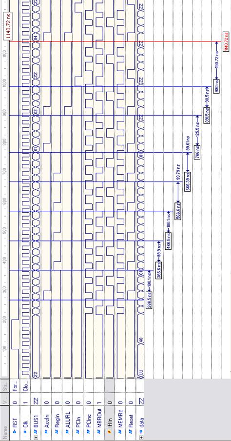 Временная диаграмма работы процессора при заданной программе приведена на рис. 3, где data – данные из памяти. На рис. 4. можно увидеть задержки и определить временные характеристики работы процессора.