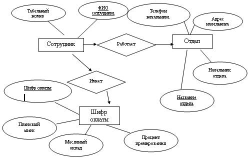 · “Сотрудники” с атрибутами: ФИО сотрудника, табельный номер, шифр вида оплаты, отдел его работы.
