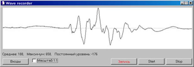 Тут с её использованием всё просто. Если имеется микрофон, то можно сразу записывать звук нажав на кнопку «Запись», который выделен красным цветом. Кнопка «Start» предназначена для воспроизведения записанного звука. Кнопка «Stop» останавливает запись и подготавливает его для воспроизведения. Записанный звук сохраняется под расширением .WAV. Кнопка «Входы» предназначен для приёма и показа звука с одного из входов. Звук показывается на рабочей области программы кривыми линиями. Кривые линии - это диапазон звука. |