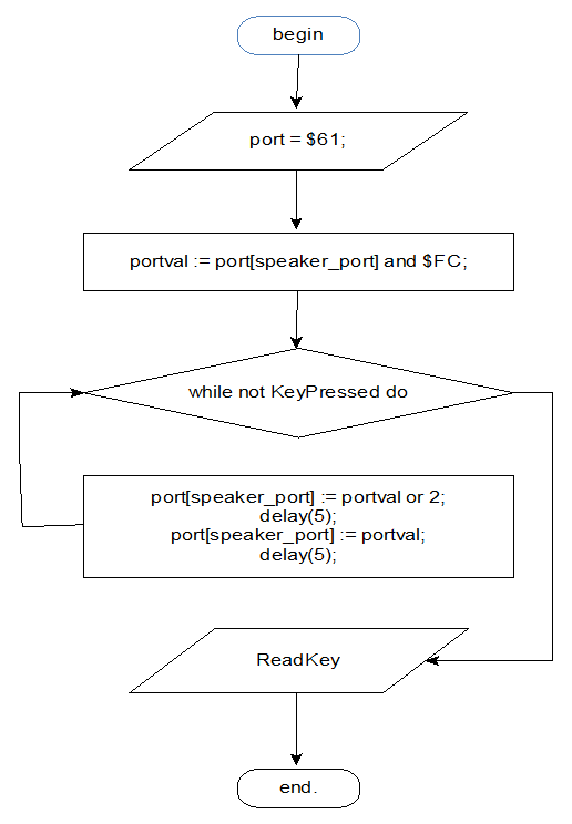 Приложения Приложение А Текст программы speaker 1 Листинг : Program speaker 1; Uses crt; Const Speaker_port = %61; Var Portval : byte; Begin Portval := port[speaker_port] and $FC; While not KeyPressed do begin Port[speaker_port] := portval or 2; Delay(5); Port[speaker_port] := portval; Delay(5); End; ReadKey; End. |