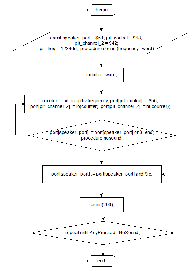 1 Общая часть 1.1 Обзор элементов языка программирования Что представляет собой звук? Свое знакомство с программированием звука на Турбо Паскале мы начнем с использования встроенного динамика. Прежде всего замечу, что модуль Crt содержит две процедуры, предназначенные для работы с динамиком. Первая из них- Sound(Hz) - включает динамик на звуковой частоте, задаваемой значением параметра Hz (типа Word) в герцах. Динамик генерирует звук до тех пор, пока он не будет отключен вызовом процедуры NoSound, не имеющей параметров Процедура Sound обеспечивает довольно бедную интонацию, потому что она использует только целочисленные частоты. Да и встроенный динамик, к сожалению, дает звук самого низкого качества Он не допускает управления громкостью, очень по-разному резонирует на разных частотах. Не ждите от него многого' Тем не менее, мы постараемся хотя бы частично исправить положение и разработаем свои собственные процедуры для модуля Speaker. Прежде всего, познакомимся поближе с работой встроенного динамика. Источником звуковых акустических колебаний является его диффузор. Он может находиться в одном из двух возможных положений. Для управления работой динамика ему посылаются прямоугольные импульсы определенной частоты. В течение первой половины каждого цикла диффузор перемещается в одно положение, а затем, в течение второй половины цикла, в другое. Это вызывает движение воздуха. В процессе генерации акустических колебаний прямоугольный импульс, который порождает неприятно звучащую ноту, несколько сглаживается. Так возникает звуковой сигнал. Теперь несколько слов о технических деталях. Компьютер содержит микросхему 8255, которую называют «программируемым периферийным интерфейсом» (PPI — Programmable Peripheral Interface). PPI управляет работой динамика, используя микросхему таймера 8254 (PIT — Programming Interval Timer). Микросхема 8255 имеет различные порты, включая порт ввода\вывода $61 размером («шириной») в один байт с битами b7…b0. Запись в порт $61 нулевого либо единичного значения бита b0 позволяет установить режим управления динамиком. Если b0 = 1, то динамиком управляет второй канал микросхемы таймера. Микросхема таймера имеет 3 канала, каждый из которых предназначен для решения своих задач. Нулевой канал обслуживает системные часы, первый канал обслуживает микросхему прямого доступа к памяти (DMA). Второй канал связан со встроенным динамиком. Обычно он запрограммирован на генерацию последовательности прямоугольных импульсов, что дает при включении динамика непрерывный тон определенной частоты. Управление встроенным динамиком связано прежде всего с программированием второго канала таймера. Для работы с таймером используются порты (всего 4), на которых для нас интерес представляют порт $42 (порт второго канала таймера) и порт $43 (порт управляющего слова — открыт только для записи). Каждый канал имеет свой |