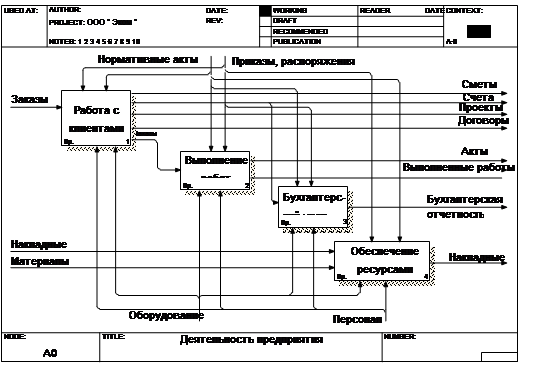 Основу моделирования деятельности предприятия или его структурной единицы составляет графический язык описания бизнес процессов. Модель в нотации IDEF0 представляет собой совокупность иерархически упорядоченных и взаимосвязанных диаграмм. Цель модели AS-IS определение наиболее слабых и нерациональных участков работы предприятия. Для изучаемого объекта модель AS-IS была построена на основе изучения документооборота организации, опроса работников предприятия.