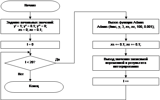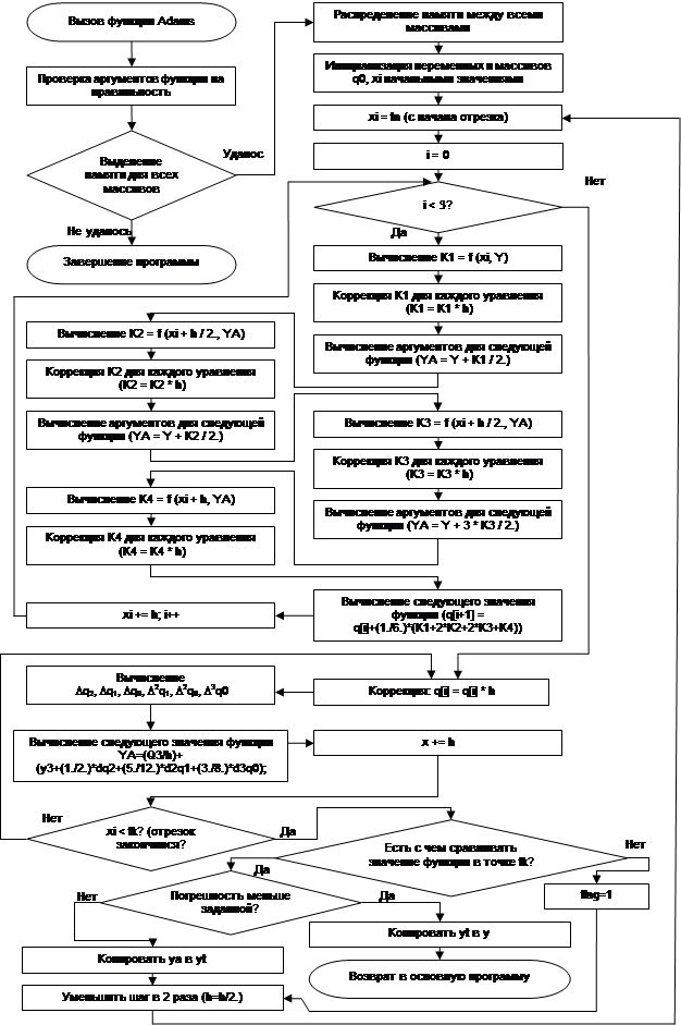 Для запуска экстраполяционного метода Адамса требуется 4 начальных значения функции. Одно значение уже задано, а остальные получаются по методу Рунге-Кутта 4 порядка. После вычисления значения в конце отрезка происходит вычисление относительной погрешности (из текущих и ранее полученных с шагом h значений функции) и сравнение её с заданным значением. Если полученная погрешность меньше, чем заданная, то считается, что задача выполнена и происходит возврат в вызывающую программу с полученным значением функции. Если же нет – то уменьшается в 2 раза шаг и весь процесс, начиная с метода Рунге-Кутта, повторяется вновь (для вычисления новых значений функции). Так продолжается до тех пор, пока полученное значение погрешности не станет меньше чем заданное.