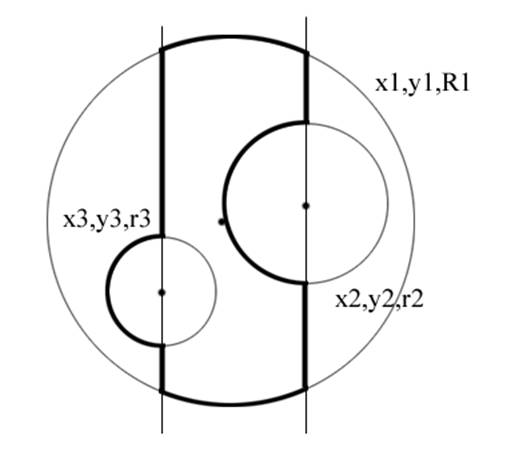 Задание: Разработать программу для построения изображения фигуры, приведенной на рисунке. Исходные данные (x1,y1,R1,x2,y2,r2,x3,y3,r3) должны быть считаны из выбранного пользователем файла. Осуществлять проверку исходных данных на соответствие варианту (две окружности находятся внутри третьей).