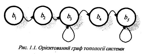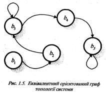 Наприклад, для задання топології поліграфічної системи оперативного викуску однокольорових брошур вказана така множина вершин В= {b1 – комп’ютер, b2 – дублікатор, b3 – колатор, b4 – степлер-фальцовщик, b5 – одноножовий різак } і така множина пар вершин D={d1 =(b1 b2 ); d2 =(b2 b3 ); d3 =(b3 b3 ); d4 =(b3 b4 ); d5 ; d6 =(b5 b5 )}. В цій системі, орієнтований граф топології якої наведено на рис. 1.1., з’єднання, що відповідає парі вершин), забезпечує передачу інформації про поточну звертальну шпальту видання на дублікатор, який забезпечує друкування цієї шпальти заданим накладом. З’єднання (b2 b3 ) відповідає передачі накладу задрукованої шпальти на колатор. В колаторі проводиться накопичення всіх шпальт брошури. Як тільки буде прийнято від дублікатора наклад останньої шпальти даного видання, тоді він приступить до формування зошитів брошури, що будуть складатися із певної послідовності задрукованих шпальт. Власне цей процес відображений парою вершин (b3 b3 ). Зформований зошит брошури подається в степлер-фальцовщик за допомогою зв’язку, який описується парою вершин (b3 b4 ). Після скріплення та фальцування шпальт брошура через зв’язок, який описується парою вершин (b4 b5 ), подається на одноножовий різак. Парою вершин (b5 b5 ) відображається послідовна обрізка трьох боків брошури. Цілком очевидно, що пара вершин є впорядкованими, тобто (b1 b2 )≠(b2 b1 ).