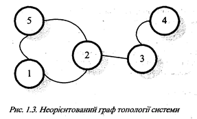 Якщо в топології системи пари елементів, що з’єднані між собою, не впорядковані, тобто між парами встановлений зв’язок від одного елемента до іншого і навпаки (наприклад, з’єднання в комп’ютерно-видавничій системі комп’ютер-модем, модем-комп’ютер тощо), то така топологія задається неорієнтованим графом. Приклад такого графа є на рис.1.3. Дуга в неорієнтованому графі не має стрілок або має відразу дві стрілки на кінцях.