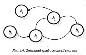 Топологія системи може мати деяку множину елементів, між якими встановлені певні відношення, та іншу множину елементів, між якими не встановлено відношень. Наприклад, для задання топології в комп’ютерно-видавничій системі (КВС) вказана така множина вершин В={b1 –1-й комп’ютер, b2 – 2-й комп’ютер, b3 – сканер, b4 – модем, b4 – лазерна друкарка} і така множина пар вершин D= {d1 =(b1 ,b2 ); d2 =(b2 ,b1 ); d3 =(b2 ,b4 ); d4 =(b3 ,b1 ); d5 =(b1 ,b4 ); d6 =(b2 ,b5 ); d7 =(b4 ,b1 ); d8 =(b4 ,b2 )}, для якої (b1 ,b2 )= (b2 ,b1 ), (b1 ,b4 )= (b4 ,b1 ), (b2 ,b4 )= (b4 ,b2 ), але (b3 ,b1 )≠ (b1 ,b3 ) і (b2 ,b3 ) ≠ (b5 ,b2 ). Ця топологія буде описуватися змішаним графом, який наведено на рис.1.4.