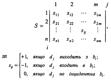 Якщо топологія задається орієнтованим графом G=(B,E), де B={b1 ,b2 ,…bn }, D={d1 ,d2 ,…dm }, то матриця інциденцій для дуг S матиме такий вигляд: