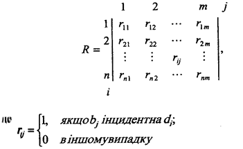 Якщо топологія задається неорієнтованим графом G=(B,E), де B={b1 ,b2 ,…bn }, D={d1 ,d2 ,…dm }, то матриця інциденцій для ребер R матиме такий вигляд: