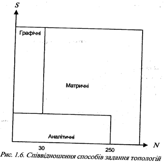 Якщо для порівняння описаних способів задання топологій взяти такі два параметри, як кількість елементів N, з яких складається система, та кількість систем S, топології яких повинні бути задані, то отримаємо співвідношення, наведені на рис.1.6.