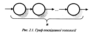 Послідовною топологією називається така топологія систем, яка містить n- елементів, серед яких є один вхідний елемент, один вихідний елемент, а решта елементів з’єднані з ними таким чином, що від вхідного елемента до вихідного є лише один маршрут з’єднань (рис.2.1.).