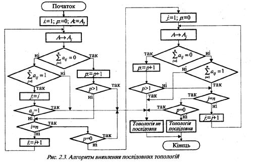 На рис.2.3. наведено алгоритм виявлення послідовних топологій, в основу якого покладено аналіз матриці суміжності. В ньому, крім попередніх та загальновідомих позначень , прийнято, що і – номер рядка матриці суміжності, j – номер стовпця матриці суміжності, р – кількість нульових рядків матриці суміжності.