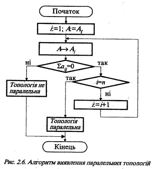 На рис.2.6. наведено алгоритм виявлення паралельних топологій, в основу якого покладено аналіз матриці суміжності.