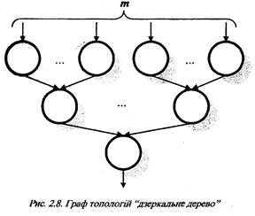 Топологією «дзеркальне дерево» називається така топологія системи, яка містить n елементів (n≥3), серед яких є m вхідних елементів ((n-1)≥m>1) та один вхідний елемент, а від кожного вхідного елемента до вихідного є лише один маршрут з’єднань (рис.2.8.).