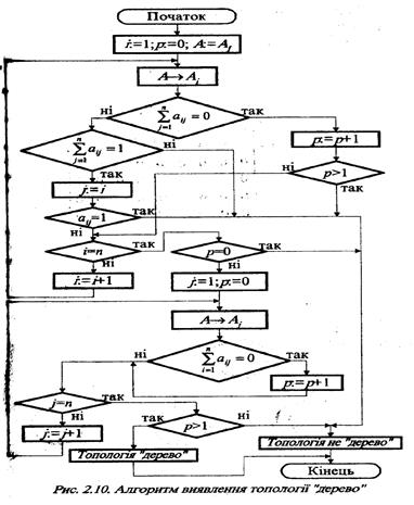 На рис.2.10. yаведено алгоритм виявлення топології «дерево», в осноку якого покладено аналіз матриці суміжності.