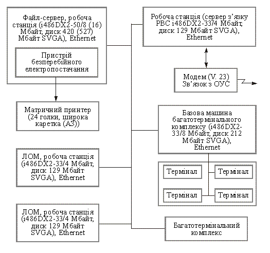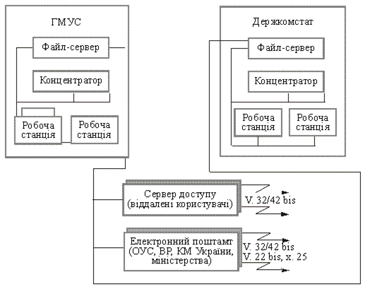 Одна з робочих станцій оснащується модемом, який забезпечує обмін даних відповідно до протоколу V.23 по комутованих телефонних каналах Міністерства зв’язку України, і виконує функції сервера зв’язку районного відділу статистики.