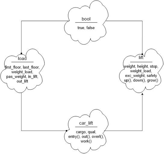 · класс «лифт», описывающий основную функциональность лифта. Этот класс наследуется классом «грузовой лифт» с добавлением членов-данных и членов функций.