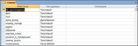 2. Однозначные вопросы сгруппировать в одной таблице, имеющей столько полей, сколько однозначных вопросов определили в анкете. Названия столбцов должны соответствовать вопросам. Названия без пробелов (использовать нижнее подчеркивание). Ключевым полем в таблице будет № респондента числового типа. Для остальных полей выбираем тип данных текстовый и дата/время для поля дата рождения. Для открытых полей выбираем тип поля – MEMO.