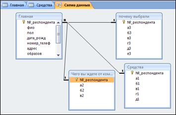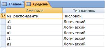 3. Для каждого многозначного вопроса создается отдельная таблица, где ключевым полем также будет № респондента такого же типа, что и в основной таблице. Остальные поля логического типа. В данной анкете таких подчиненных таблиц будет 3.