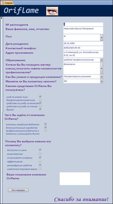 В начале работы был поставлен ряд задач, которые были выполнены. В результате создана форма, с которой имеется доступ ко всей необходимой для исследования информации: анкете, запросам. Пользователь также может быстро распечатать, отправить по почте, сохранить в файл нужные ему сведения. Анкетная форма удобна, проста и понятна для заполнения.