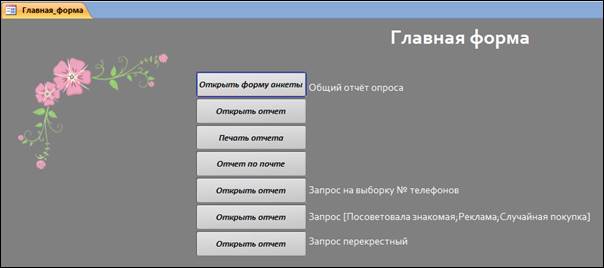 9. Создание главной кнопочной формы базы данных. С данной формы осуществляется переход на форму анкеты, на отчеты по запросам, печать отчетов, отправка их по почте, сохранение в файл и другое. Каждой кнопке присваивается определенное действие.
