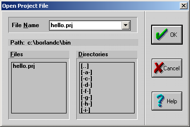 С помощью подокна Directories (каталоги) производится выбор рабочего каталога, а в поле File Name (имя файла) вводится имя проекта, например Hello.prj. В переменной Path (путь) отображается полное имя рабочего каталога, где хранится файл проекта. По завершении определения проекта следует нажать кнопку ОК.