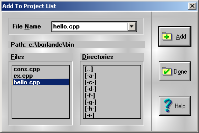 Если проект создается заново, то необходимо указать исходные файлы, из которых строится исполняемый модуль. Указание производится в окне формирования проекта (рис. 6), которое вызывается по команде Project|Add item.