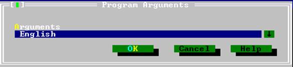 Задание аргументов командной строки. Так как язык сообщения программа Hello.exe берет из командной строки, то перед выполнением программы необходимо задать язык в окне, появляющемся по команде Run|Arguments (рис. 8). В этом случае задано имя языка English.