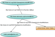 Граф визитной карточки основателя Википедии в формате RDF. Все элементы этого графа (как узлы, так и дуги) являются URI, включая литерал, изображённый в оранжевом прямоугольнике.
