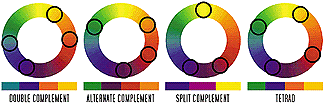На этом этапе мы уже можем приступить к более сложным комбинациям. Например, можно взять две пары комплиментарных цветов, что называется "двойной комплемент" (double complement). Скажем, желтый и пурпурный/лиловый, и синий и оранжевый. Другой схемой является альтернативный комплемент (alternate complement), когда комбинируется триада цветов с цветом, комплиментарным одному из цветов триады. Зеленый, красно-пурпурный, красный и оранжевый - пример такой комбинации. Также существует "расщепленный комплемент" (split complement), когда берется цвет, его комплиментарный цвет и два прилегающих к нему цвета.